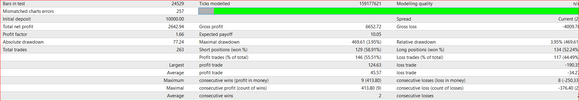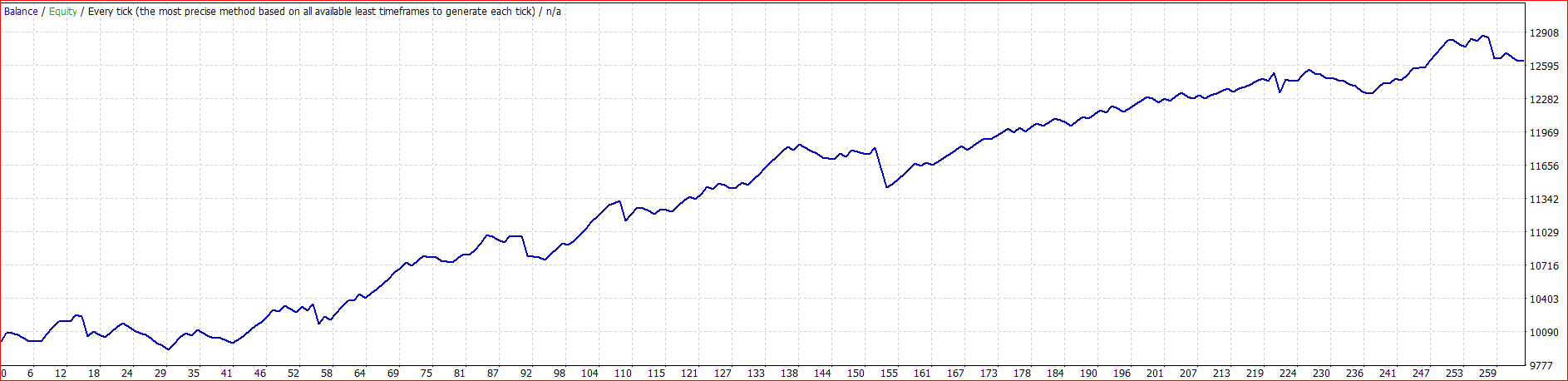 The iChi forex robot generates 2642 pips with 263 trades. The profit factor of the expert advisor is 1.66.